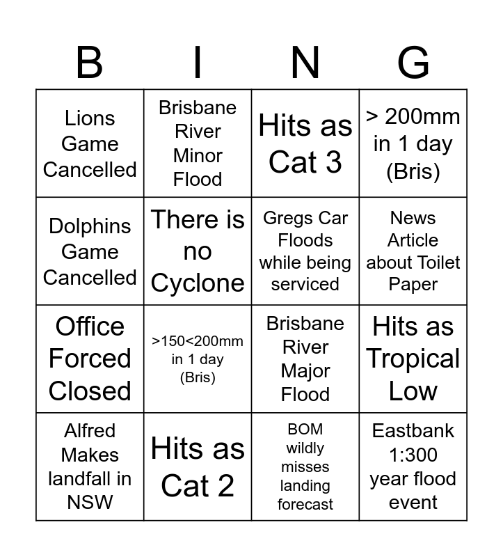This bingo card has 16 words: Hits as Cat 2, Hits as Tropical Low, Hits as Cat 3, Lions Game Cancelled, Office Forced Closed, Brisbane River Minor Flood, Brisbane River Major Flood, BOM wildly misses landing forecast, Dolphins Game Cancelled, There is no Cyclone, Alfred Makes landfall in NSW, > 200mm in 1 day (Bris), >150<200mm in 1 day (Bris), News Article about Toilet Paper, Gregs Car Floods while being serviced and Eastbank 1:300 year flood event.