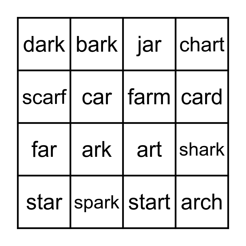 This bingo card has 16 words: spark, shark, jar, dark, far, bark, art, start, scarf, car, star, chart, ark, card, farm and arch.