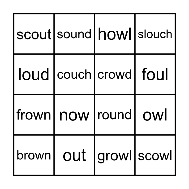 This bingo card has 16 words: out, owl, howl, scout, frown, sound, round, growl, loud, couch, brown, slouch, now, foul, crowd and scowl.