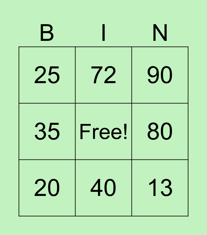This bingo card has a free space and 8 words: 80, 90, 72, 20, 25, 13, 35 and 40.