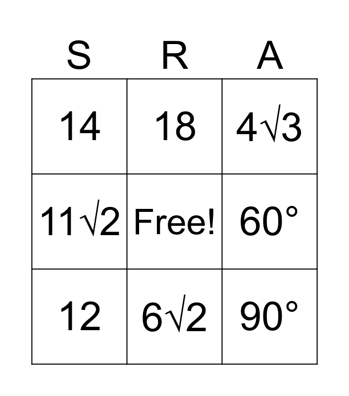 This bingo card has a free space and 15 words: 5√2, 5, 4√3, 14, 6√2, 90°, 8√3, 30°, 60°, 8√2, 6, 11√2, 12, 18 and 15√3.