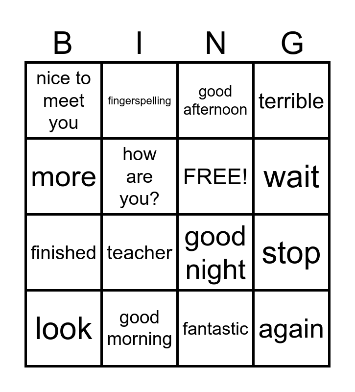 This bingo card has 16 words: good morning, stop, good afternoon, nice to meet you, finished, fingerspelling, good night, fantastic, more, how are you?, look, terrible, teacher, wait, FREE! and again.