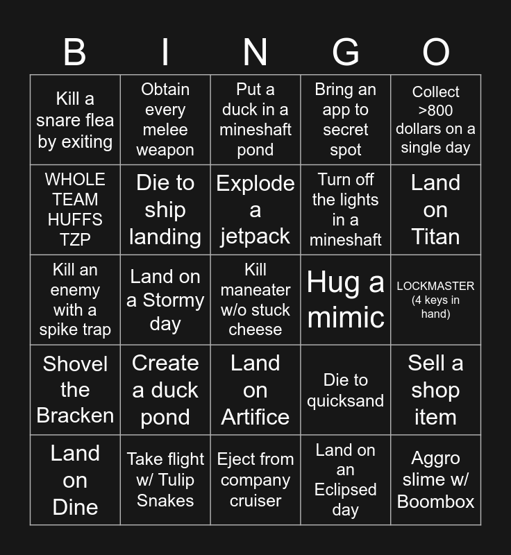 This bingo card has 49 words: Ladder clip into kitchen counter, Kill maneater w/o stuck cheese, Save yourself DURING a Giant grab, Eject from company cruiser, Create a duck pond, Spray paint 732 ANYWHERE, Obtain every melee weapon, FULL CLEAR any moon, WHOLE TEAM HUFFS TZP, Collect 3 easter eggs, Die to ship landing, Bring an app to secret spot, Sell a shop item, Die to quicksand, Anger Jeb and survive, Anger Jeb with clown/airhorn, Explode a jetpack, Hug a mimic, Kill a Thumper on offense, Collect >800 dollars on a single day, Land on a Stormy day, Land on an Eclipsed day, Kill a snare flea by exiting, Turn off the lights in a mineshaft, Do the Offense fire exit jump, Land on Titan, Land on Dine, Land on Rend, Land on Artifice, Shovel the Bracken, Buy any item with a 60% or more sale, Obtain Candy, Buy a Zap gun, Land on a Foggy day, Take flight w/ Tulip Snakes, Void teammate with belt bag and ladder, Kill a Butler, Fulfill Quota 3 ., LOCKMASTER (4 keys in hand), Obtain 2 Robot Toys, Give a lootbug a gun, Kill an Eyeless dog, Aggro slime w/ Boombox, Give a lootbug a knife, Kill an enemy with a spike trap, Put a duck in a mineshaft pond, Land on Embrion, Bring Maneater outside and Sell on a 77% day.
