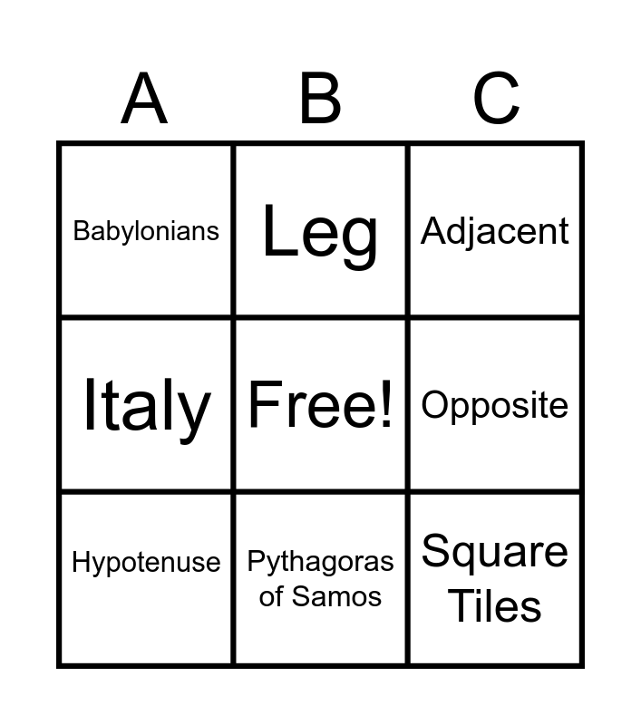 This bingo card has a free space and 11 words: Pythagorean Theorem, Pythagoras of Samos, Square Tiles, Hypotenuse, Leg, Adjacent, Opposite, Right Triangle, Italy, Babylonians and Croton.