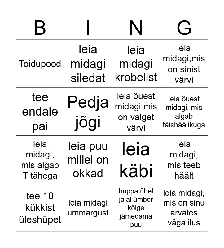 This bingo card has 16 words: leia midagi ümmargust, leia midagi, mis teeb häält, leia midagi krobelist, Toidupood, leia midagi, mis algab T tähega, leia midagi siledat, leia käbi, hüppa ühel jalal ümber kõige jämedama puu, tee endale pai, Pedja jõgi, tee 10 kükkist üleshüpet, leia midagi,mis on sinist värvi, leia puu millel on okkad, leia õuest midagi, mis algab täishäälikuga, leia õuest midagi mis on valget värvi and leia midagi, mis on sinu arvates väga ilus.