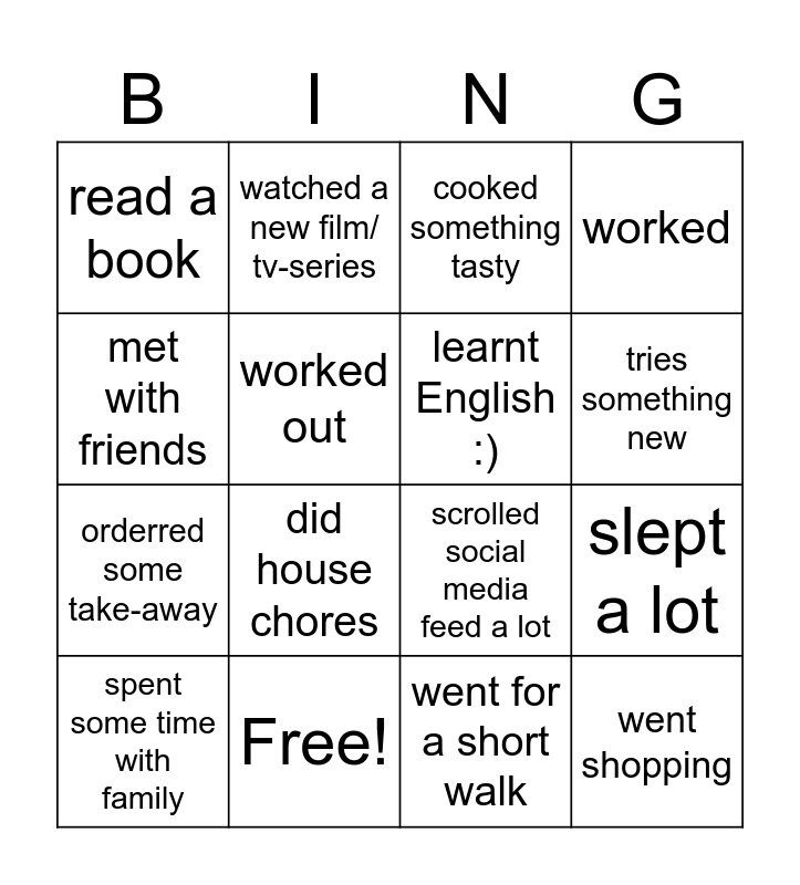 This bingo card has 16 words: Free!, slept a lot, cooked something tasty, read a book, orderred some take-away, watched a new film/ tv-series, scrolled social media feed a lot, went for a short walk, met with friends, worked out, spent some time with family, worked, did house chores, tries something new, learnt English :) and went shopping.
