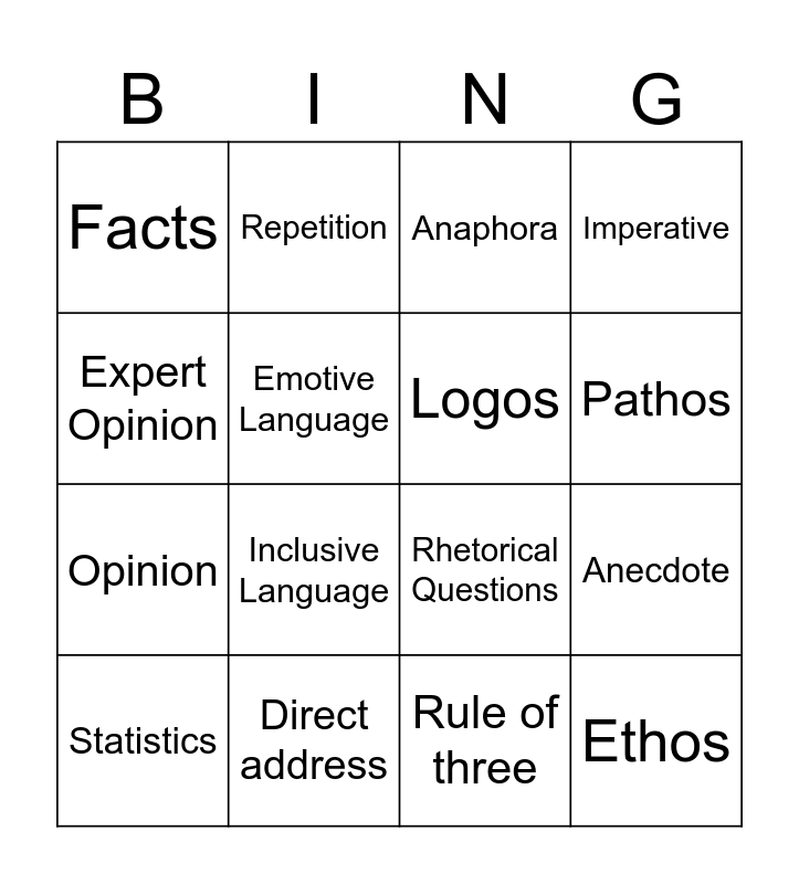 This bingo card has 16 words: Direct address, Anecdote, Anaphora, Facts, Opinion, Repetition, Rhetorical Questions, Rule of three, Expert Opinion, Emotive Language, Statistics, Imperative, Inclusive Language, Pathos, Logos and Ethos.