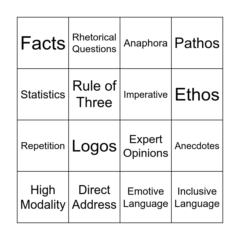 This bingo card has 16 words: Direct Address, Anecdotes, Anaphora, Facts, Repetition, Rhetorical Questions, Expert Opinions, Emotive Language, Statistics, Rule of Three, High Modality, Pathos, Logos, Ethos, Imperative and Inclusive Language.
