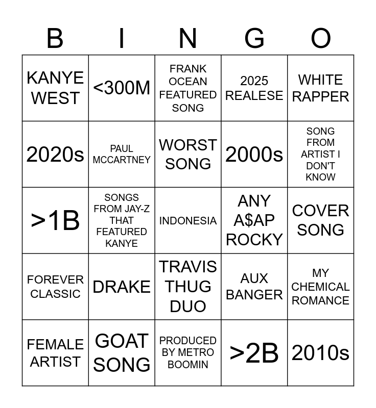 This bingo card has a free space and 24 words: DRAKE, GOAT SONG, WORST SONG, FEMALE ARTIST, WHITE RAPPER, KANYE WEST, 2020s, <300M, ANY A$AP ROCKY, TRAVIS THUG DUO, 2000s, >1B, AUX BANGER, MY CHEMICAL ROMANCE, PAUL MCCARTNEY, >2B, COVER SONG, FRANK OCEAN FEATURED SONG, SONG FROM ARTIST I DON'T KNOW, SONGS FROM JAY-Z THAT FEATURED KANYE, 2010s, FOREVER CLASSIC, 2025 REALESE and PRODUCED BY METRO BOOMIN.