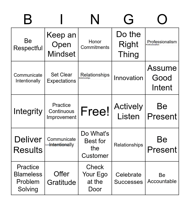 This bingo card has 6 images, a free space and 37 words: Practice Continuous Improvement, Innovtion, Be Accountable, Set Clear Expectations, Be Present, Communicate Intentionally, Relationships, Collaboration, Professionalism, Deliver Results, Practice Continuous Improvement, Do the Right Thing, Be Accountable, Be Present, Communicate Intentionally, Deliver Results, Set Clear Expectations, Honor Commitments, Do What's Best for the Customer, Actively Listen, Be Respectful, Assume Good Intent, Practice Blameless Problem Solving, Check Your Ego at the Door, Make Full Preparation, Celebrate Successes, Keep an Open Mindset, Make it Fun, Always Ask Why, Get the Facts, Pay Attention to the Details, Offer Gratitude, Integrity, Professionalism, Relationships, Innovation and Collaboration.