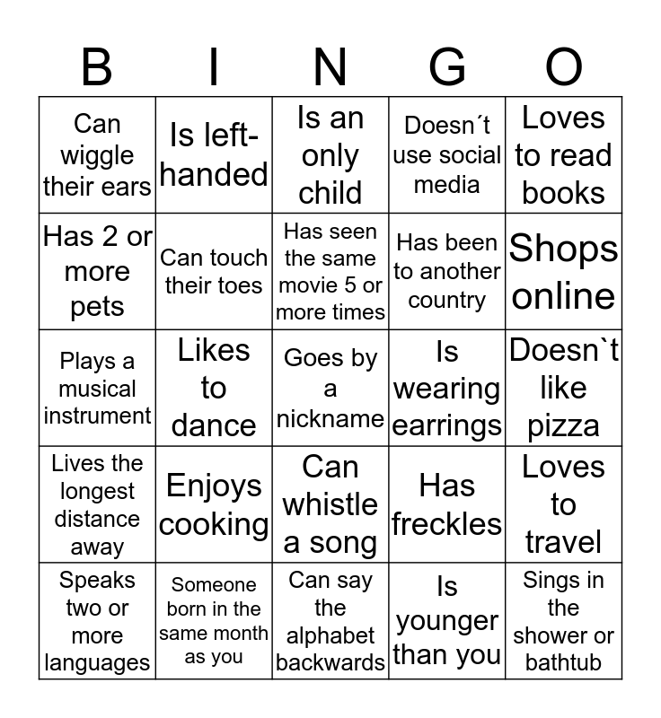 This bingo card has a free space and 24 words: Enjoys cooking, Someone born in the same month as you, Has seen the same movie 5 or more times, Speaks two or more languages, Loves to read books, Can wiggle their ears, Has 2 or more pets, Is left-handed, Is wearing earrings, Can whistle a song, Has been to another country, Plays a musical instrument, Has freckles, Loves to travel, Can touch their toes, Is younger than you, Doesn`t like pizza, Is an only child, Shops online, Likes to dance, Sings in the shower or bathtub, Lives the longest distance away, Doesn´t use social media and Can say the alphabet backwards.