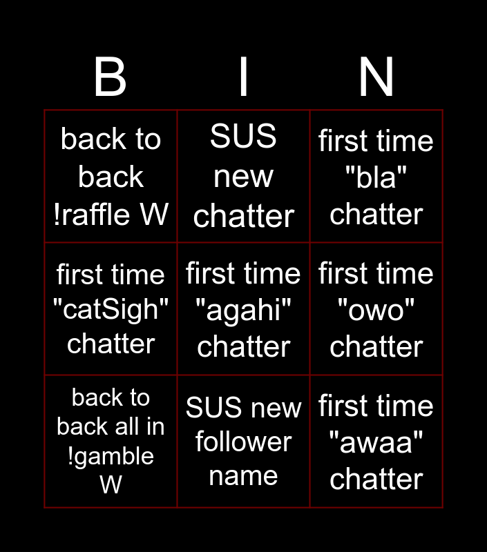 This bingo card has a free space and 8 words: first time "owo" chatter, first time "bla" chatter, SUS new chatter, back to back all in !gamble W, back to back !raffle W, first time "awaa" chatter, first time "catSigh" chatter and SUS new follower name.