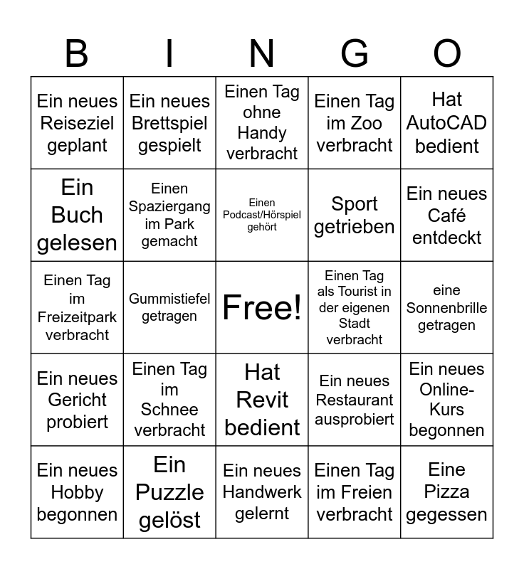 This bingo card has a free space and 27 words: Ein neues Restaurant ausprobiert, Einen Ausflug gemacht, Sport getrieben, Ein neues Handwerk gelernt, Ein Buch gelesen, Einen Tag ohne Handy verbracht, Ein neues Brettspiel gespielt, Ein neues Gericht probiert, Einen Tag als Tourist in der eigenen Stadt verbracht, Ein neues Online-Kurs begonnen, Einen Tag im Freizeitpark verbracht, Einen Tag im Zoo verbracht, Ein neues Hobby begonnen, Ein Puzzle gelöst, Ein neues Café entdeckt, Ein neues Fitnessstudio ausprobiert, Einen Spaziergang im Park gemacht, Einen Podcast/Hörspiel gehört, Einen Tag im Schnee verbracht, Ein neues Reiseziel geplant, eine Sonnenbrille getragen, Einen Tag im Freien verbracht, Gummistiefel getragen, Eine Pizza gegessen, Hat Revit bedient, Hat AutoCAD bedient and Hat Linear bedient.