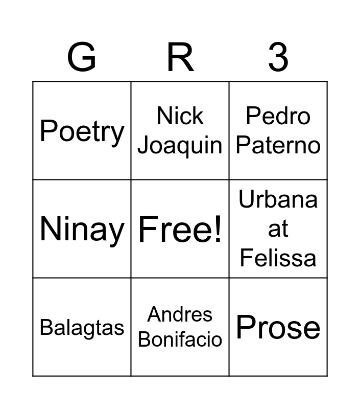 This bingo card has a free space and 8 words: Urbana at Felissa, Pedro Paterno, Nick Joaquin, Balagtas, Poetry, Prose, Ninay and Andres Bonifacio.
