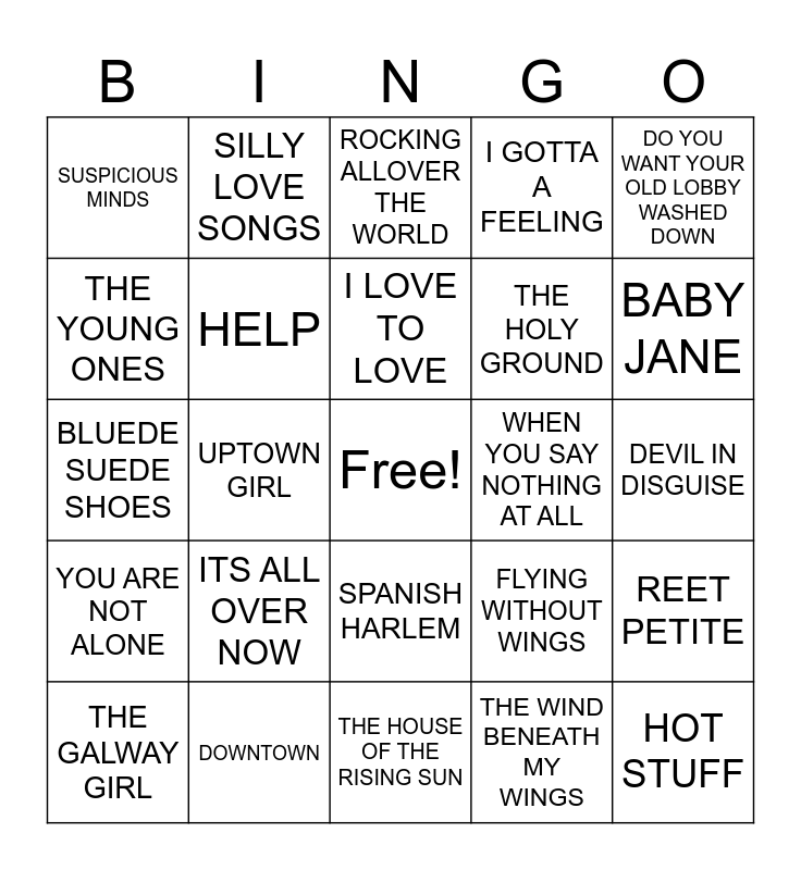 This bingo card has a free space and 44 words: GHOSTBUSTERS, HOT STUFF, TAINTED LOVE, THE GALWAY GIRL, SUGAR SUGAR, THE WIND BENEATH MY WINGS, ROCKING ALLOVER THE WORLD, MAGGIE MAY, DO YOU WANT YOUR OLD LOBBY WASHED DOWN, DOWNTOWN, I GOTTA A FEELING, WHEN YOU SAY NOTHING AT ALL, SPANISH HARLEM, ITS ALL OVER NOW, SIMPLY THE BEST, THE HOUSE OF THE RISING SUN, I DONT WANT TO TALK ABOUT IT, BLUEDE SUEDE SHOES, BORN TO BE ALIVE, BABY JANE, SILLY LOVE SONGS, STEAL MY GIRL, WHAT MAKES YOU BEAUTIFUL, SUSPICIOUS MINDS, MAMBO NO 5, DEVIL IN DISGUISE, MISSING YOU, ROCK THE BOAT, FLYING WITHOUT WINGS, YOU ARE NOT ALONE, LILY THE PINK, REET PETITE, IF I COULD TURN BACK TIME, DRIFT AWAY, UPTOWN GIRL, PARTIME LOVER, PENNY ARCADE, PEARL A SINGER, I LOVE TO LOVE, THE YOUNG ONES, THE HOLY GROUND, THATS LIFE, HELP and GOOD LOOKING WOMAN.