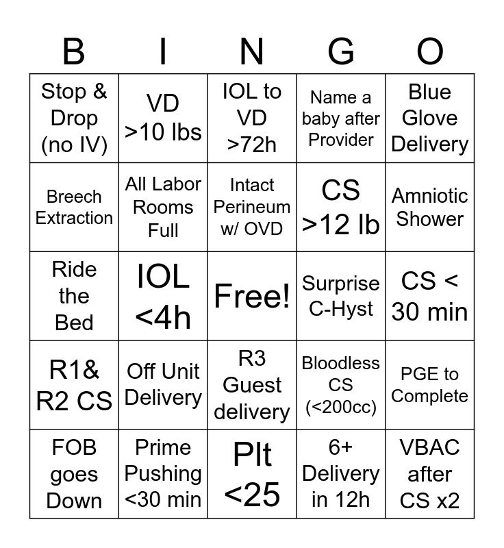 This bingo card has a free space and 24 words: Off Unit Delivery, Prime Pushing <30 min, Intact Perineum w/ OVD, FOB goes Down, Blue Glove Delivery, Stop & Drop (no IV), Breech Extraction, VD >10 lbs, Surprise C-Hyst, R3 Guest delivery, CS >12 lb, Ride the Bed, Bloodless CS (<200cc), PGE to Complete, All Labor Rooms Full, 6+ Delivery in 12h, CS < 30 min, IOL to VD >72h, Amniotic Shower, IOL <4h, VBAC after CS x2, R1& R2 CS, Name a baby after Provider and Plt <25.