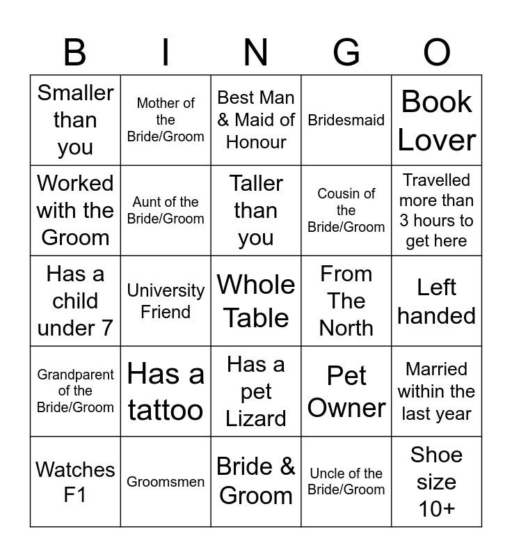 This bingo card has 25 words: Grandparent of the Bride/Groom, Groomsmen, Whole Table, Uncle of the Bride/Groom, Book Lover, Smaller than you, Mother of the Bride/Groom, Best Man & Maid of Honour, From The North, Married within the last year, Worked with the Groom, Aunt of the Bride/Groom, Bride & Groom, Pet Owner, Travelled more than 3 hours to get here, Watches F1, University Friend, Taller than you, Cousin of the Bride/Groom, Left handed, Has a child under 7, Has a tattoo, Has a pet Lizard, Bridesmaid and Shoe size 10+.
