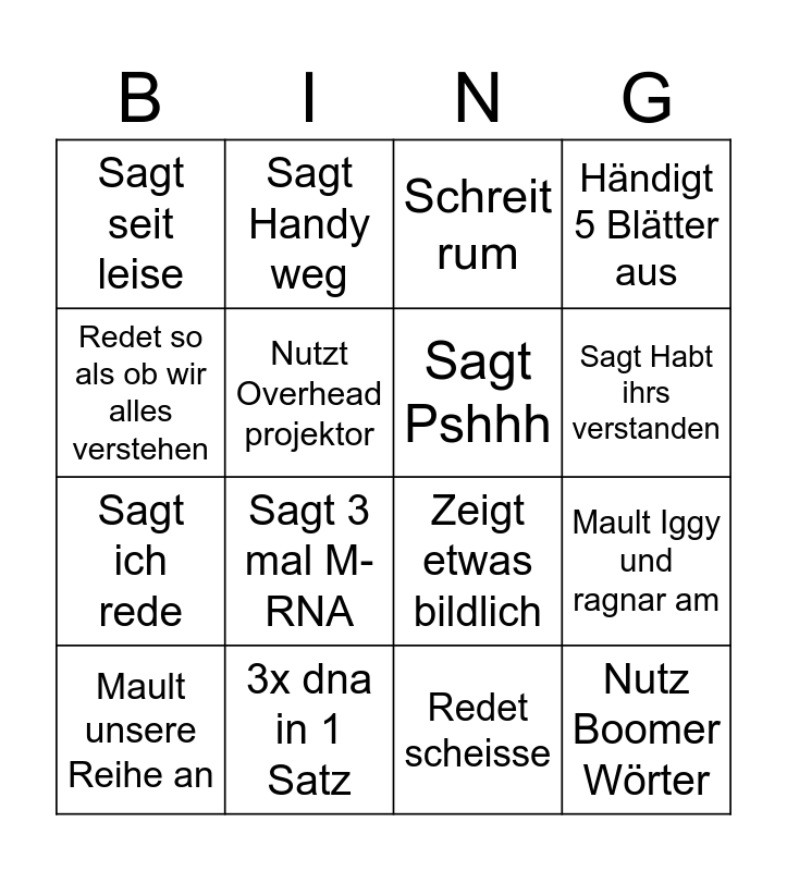 This bingo card has 16 words: 3x dna in 1 Satz, Mault Iggy und ragnar am, Schreit rum, Sagt seit leise, Sagt ich rede, Sagt Handy weg, Zeigt etwas bildlich, Redet scheisse, Redet so als ob wir alles verstehen, Nutzt Overhead projektor, Mault unsere Reihe an, Händigt 5 Blätter aus, Sagt 3 mal M-RNA, Sagt Habt ihrs verstanden, Sagt Pshhh and Nutz Boomer Wörter.
