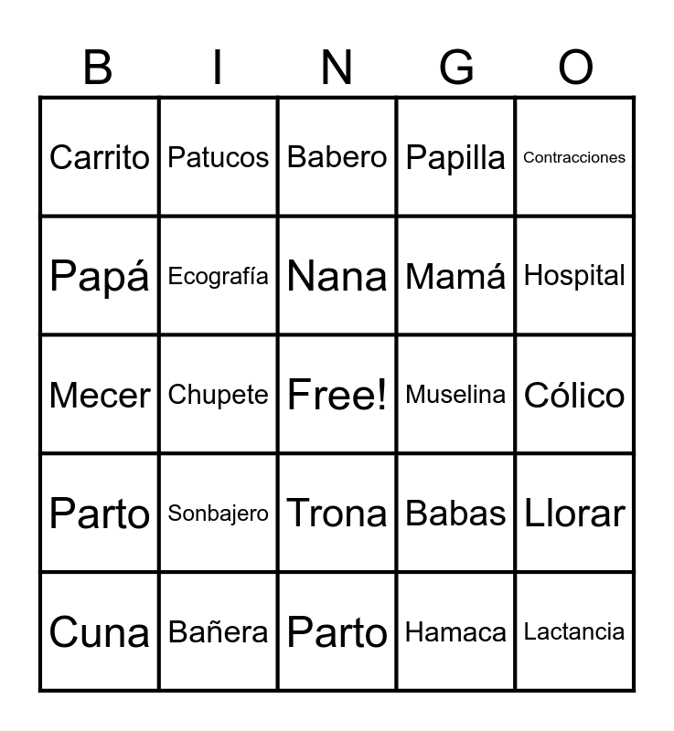 This bingo card has a free space and 29 words: Cuna, Pañal, Chupete, Biberón, Carrito, Babero, Ecografía, Sonbajero, Muselina, Bañera, Cólico, Lactancia, Parto, Hamaca, Hospital, Juguete, Trona, Parto, Contracciones, Mecer, Babas, Familia, Mamá, Papá, Papilla, Patucos, Llorar, Nana and Dormir.