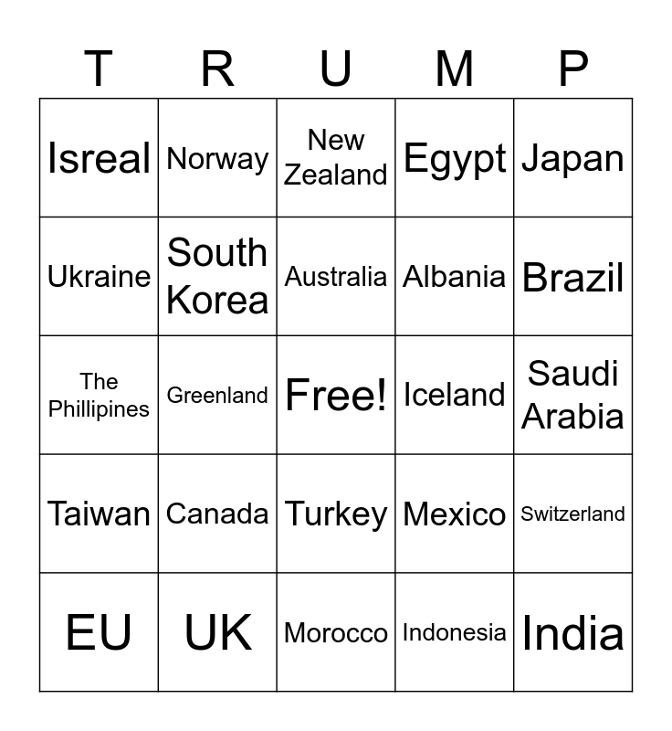 This bingo card has a free space and 24 words: Canada, UK, Australia, EU, Japan, Isreal, Ukraine, Norway, Iceland, Turkey, Albania, The Phillipines, Mexico, Switzerland, South Korea, Indonesia, Saudi Arabia, New Zealand, Brazil, Greenland, India, Taiwan, Egypt and Morocco.
