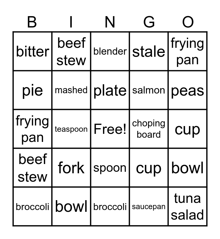 ⚠ This card has duplicate items: salmon (2), tuna salad (2), peas (2), broccoli (2), fork (2), spoon (2), beef stew (2), pork chop (2), pie (2), noodle (2), mashed (2), stale (2), bowl (2), cup (2), knife (2), glass (2), plate (2), choping board (2), blender (2), frying pan (2), teaspoon (2), saucepan (2), bitter (2)