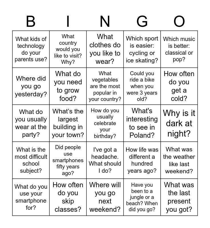 This bingo card has a free space and 24 words: Did people use smartphones fifty years ago?, How often do you skip classes?, What vegetables are the most popular in your country?, What do you use your smartphone for?, Which music is better: classical or pop?, What kids of technology do your parents use?, Where did you go yesterday?, What country would you like to visit? Why?, What's interesting to see in Poland?, I've got a headache. What should I do?, Could you ride a bike when you were 3 years old?, What do you usually wear at the party?, How life was different a hundred years ago?, What was the weather like last weekend?, What do you need to grow food?, Have you been to a jungle or a beach? When did you go?, Why is it dark at night?, What clothes do you like to wear?, How often do you get a cold?, What’s the largest building in your town?, What was the last present you got?, What is the most difficult school subject?, Which sport is easier: cycling or ice skating? and Where will you go next weekend?.
