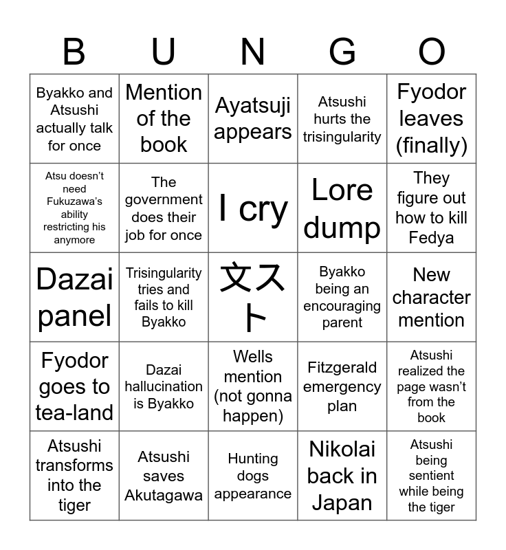 This bingo card has a free space and 24 words: Dazai hallucination is Byakko, Atsushi saves Akutagawa, I cry, Atsushi transforms into the tiger, Fyodor leaves (finally), Byakko and Atsushi actually talk for once, Atsu doesn’t need Fukuzawa’s ability restricting his anymore, Mention of the book, Byakko being an encouraging parent, Wells mention (not gonna happen), Lore dump, Dazai panel, Fitzgerald emergency plan, Atsushi realized the page wasn’t from the book, The government does their job for once, Nikolai back in Japan, New character mention, Ayatsuji appears, They figure out how to kill Fedya, Trisingularity tries and fails to kill Byakko, Atsushi being sentient while being the tiger, Fyodor goes to tea-land, Atsushi hurts the trisingularity and Hunting dogs appearance.