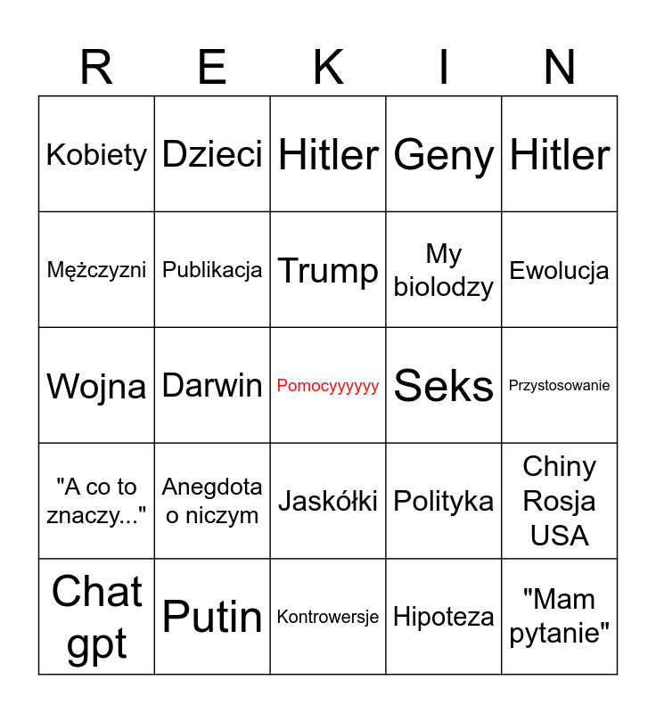 This bingo card has a free space and 24 words: Anegdota o niczym, Putin, Trump, Chat gpt, Hitler, Kobiety, Mężczyzni, Dzieci, Seks, Jaskółki, My biolodzy, Wojna, Polityka, Chiny Rosja USA, Publikacja, Hipoteza, Przystosowanie, Hitler, Ewolucja, Darwin, "Mam pytanie", "A co to znaczy...", Geny and Kontrowersje.