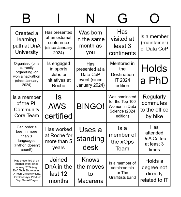This bingo card has a free space and 24 words: Has worked at Roche for more than 5 years, Joined DnA in the last 12 months, Has presented at a Data CoP event (since January 2024), Has presented at an internal event since January 2024 (e.g., DnA Tech Showcases, IX Tech University Day, DevOps Days, Product Day, GenAI Days), Is a member (maintainer) of Data CoP, Created a learning path at DnA University, Organized (or is currently organizing) or won a hackathon (since January 2024), Has presented at an external conference (since January 2024), Was nominated for the Top 100 Women in Data Science (2024 edition), Uses a standing desk, Mentored in the Destination IT 2024 edition, Is a member of the PL Community Core Team, Is a member of the xOps Team, Has attended DnA Coffee at least 3 times, Is engaged in sports clubs or initiatives at Roche, Is a member of admin:admin or The Graffitists band, Regularly commutes to the office by bike, Was born in the same month as you, Holds a PhD, Is AWS-certified, Holds a degree not directly related to IT, Can order a beer in more than 3 languages (Python doesn’t count!), Has visited at least 3 continents and Knows the moves to Macarena.
