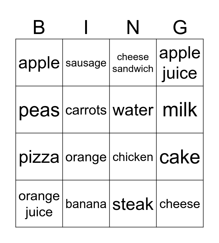 This bingo card has 16 words: banana, cake, cheese sandwich, apple, pizza, sausage, chicken, steak, peas, carrots, orange juice, apple juice, orange, milk, water and cheese.
