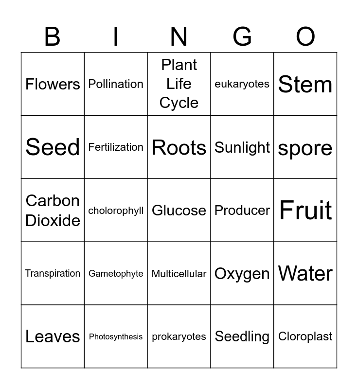 This bingo card has a free space and 24 words: Gametophyte, Photosynthesis, Roots, Leaves, Stem, Flowers, Seed, Pollination, Producer, Multicellular, Sunlight, Carbon Dioxide, Oxygen, Water, Fertilization, Seedling, Fruit, Plant Life Cycle, spore, cholorophyll, Cloroplast, Transpiration, eukaryotes and prokaryotes.