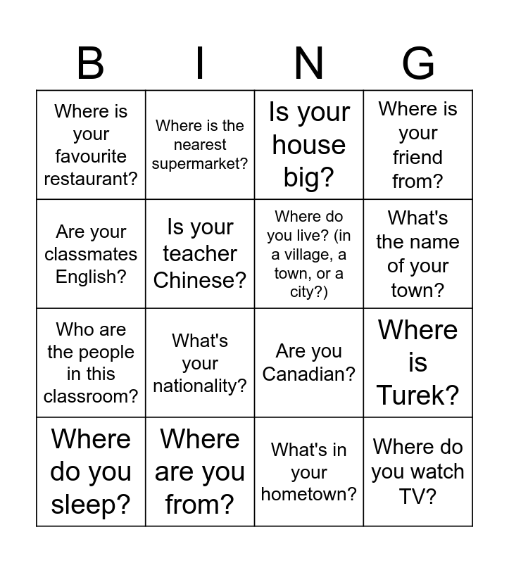 This bingo card has 16 words: Where are you from?, Where is Turek?, Is your house big?, Where is your favourite restaurant?, Who are the people in this classroom?, Where is the nearest supermarket?, Are you Canadian?, What's in your hometown?, Are your classmates English?, Is your teacher Chinese?, Where do you sleep?, Where is your friend from?, What's your nationality?, What's the name of your town?, Where do you live? (in a village, a town, or a city?) and Where do you watch TV?.