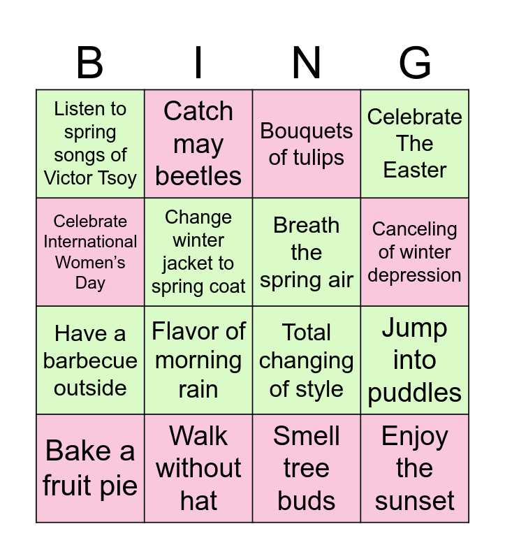 This bingo card has 16 words: Walk without hat, Jump into puddles, Bouquets of tulips, Listen to spring songs of Victor Tsoy, Have a barbecue outside, Catch may beetles, Total changing of style, Smell tree buds, Celebrate International Women’s Day, Change winter jacket to spring coat, Bake a fruit pie, Celebrate The Easter, Flavor of morning rain, Canceling of winter depression, Breath the spring air and Enjoy the sunset.