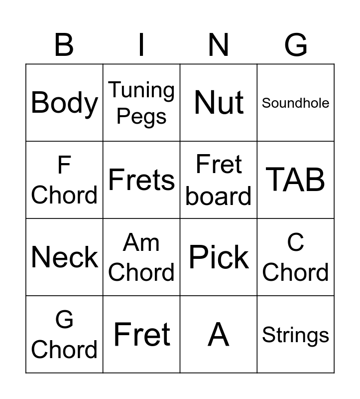 This bingo card has 22 words: Fret, Headstock, Tuning Pegs, Bridge, Frets, Fret board, Body, Nut, Pick, Strings, Neck, Soundhole, C, G, A, E, C Chord, G Chord, Am Chord, F Chord, TAB and Strumming.