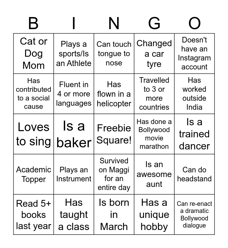 This bingo card has a free space and 24 words: Plays an Instrument, Has taught a class, Has flown in a helicopter, Read 5+ books last year, Doesn't have an Instagram account, Cat or Dog Mom, Has contributed to a social cause, Plays a sports/Is an Athlete, Has done a Bollywood movie marathon, Survived on Maggi for an entire day, Travelled to 3 or more countries, Loves to sing, Is an awesome aunt, Can do headstand, Fluent in 4 or more languages, Has a unique hobby, Is a trained dancer, Can touch tongue to nose, Has worked outside India, Is a baker, Can re-enact a dramatic Bollywood dialogue, Academic Topper, Changed a car tyre and Is born in March.
