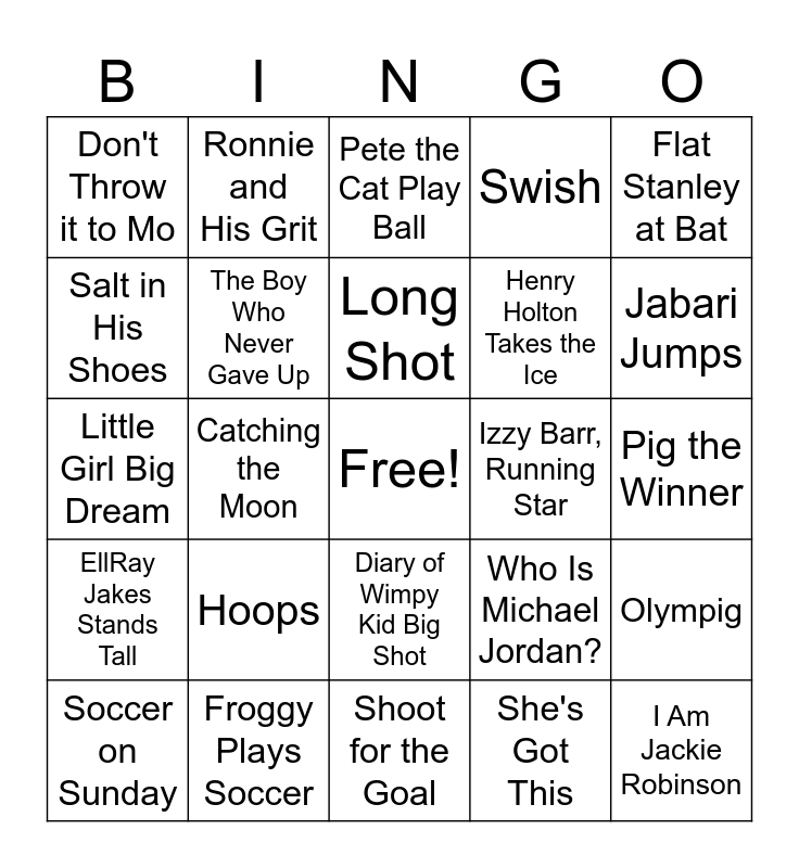 This bingo card has a free space and 24 words: Hoops, Froggy Plays Soccer, Long Shot, Soccer on Sunday, Flat Stanley at Bat, Don't Throw it to Mo, Salt in His Shoes, Ronnie and His Grit, Izzy Barr, Running Star, Diary of Wimpy Kid Big Shot, Henry Holton Takes the Ice, Little Girl Big Dream, Who Is Michael Jordan?, Olympig, The Boy Who Never Gave Up, She's Got This, Pig the Winner, Pete the Cat Play Ball, Jabari Jumps, Catching the Moon, I Am Jackie Robinson, EllRay Jakes Stands Tall, Swish and Shoot for the Goal.