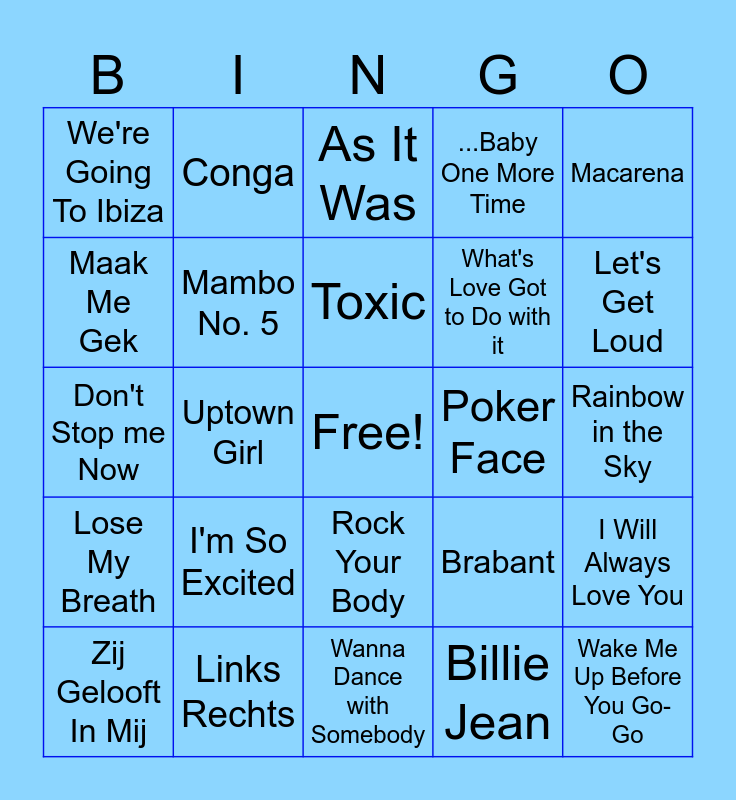 This bingo card has a free space and 50 words: I Want to Break Free, Wake Me Up Before You Go-Go, Jij Bent Zo, Wanna Dance with Somebody, I'm So Excited, Livin' on a Prayer, Conga, Dancing Queen, Maak Me Gek, Wannabe, Mambo No. 5, ...Baby One More Time, I Will Always Love You, Brabant, No Limit, Rhythm Is a Dancer, Toxic, Poker Face, 9 To 5, Macarena, Uptown Girl, Billie Jean, We're Going To Ibiza, What's Love Got to Do with it, TEXAS HOLD 'EM, Let Me Entertain You, Let's Get Loud, Boom, Boom, Boom, Boom!!, As It Was, Rock Your Body, Oops!... I Did It Again, Zij Weet Het, I Gotta Feeling, Bloed Zweet en Tranen, Links Rechts, Per Spoor, Hey Ya!, It's Raining Men, Hips Don't Lie, Rainbow in the Sky, Viva La Vida, Als Het Avond Is, What Is Love, C'est La Vie, Zij Gelooft In Mij, Don't Stop me Now, The Ketchup Song, Beat It, Lose My Breath and River Deep Mountain High.