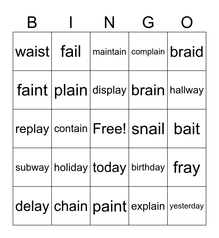 This bingo card has a free space and 27 words: birthday, saint, brain, paint, faint, maintain, fail, subway, snail, fray, replay, complain, delay, chain, hallway, retail, plain, display, holiday, waist, bait, explain, contain, yesterday, today, braid and mainstay.