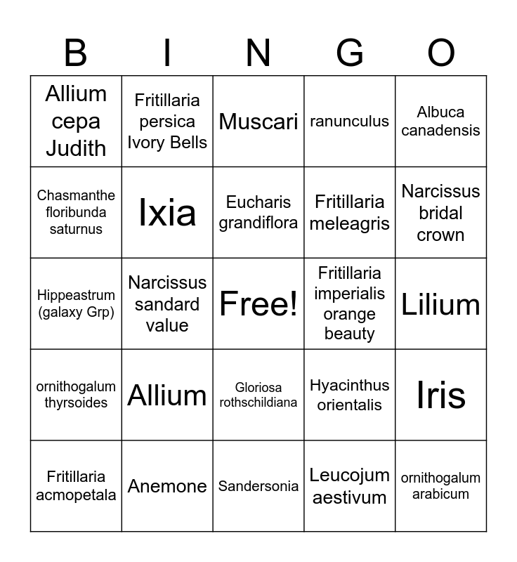 This bingo card has a free space and 24 words: Allium, Anemone, Eucharis grandiflora, Fritillaria acmopetala, Albuca canadensis, Allium cepa Judith, Chasmanthe floribunda saturnus, Fritillaria persica Ivory Bells, Fritillaria imperialis orange beauty, Gloriosa rothschildiana, Fritillaria meleagris, Hippeastrum (galaxy Grp), Hyacinthus orientalis, Iris, Ixia, Leucojum aestivum, Lilium, Muscari, Narcissus bridal crown, Narcissus sandard value, ornithogalum arabicum, ornithogalum thyrsoides, ranunculus and Sandersonia.