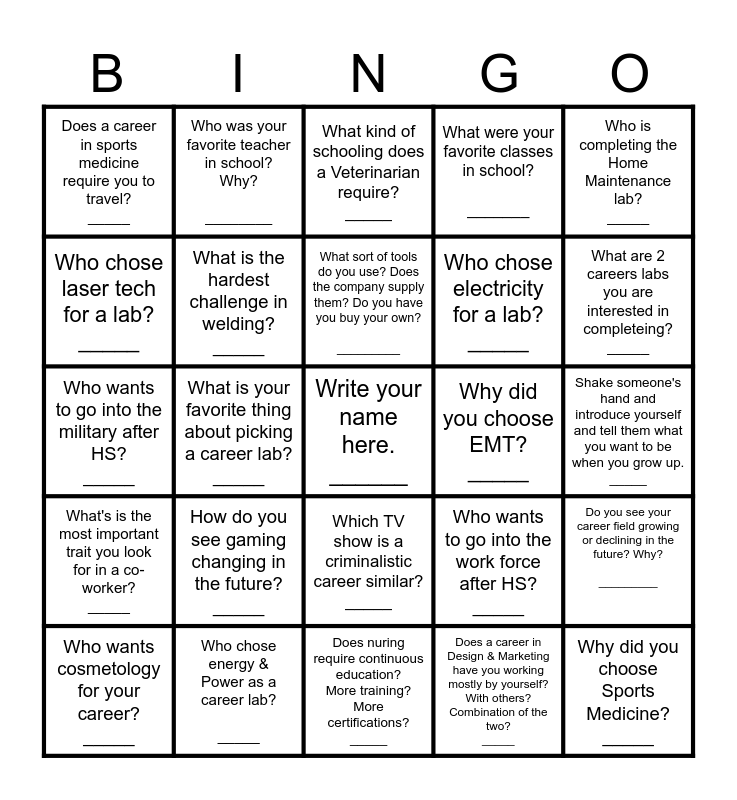 This bingo card has a free space and 29 words: Who wants cosmetology for your career? _____, Who chose Nursing for a lab? _____, What is your favorite thing about picking a career lab? _____, Explain what you do in a culinary arts career. _____, Does a career in sports medicine require you to travel? _____, What kind of schooling does a Veterinarian require? _____, What is the hardest challenge in welding? _____, How do you see gaming changing in the future? _____, Why did you choose EMT? _____, Who chose energy & Power as a career lab? _____, Shake someone's hand and introduce yourself and tell them what you want to be when you grow up. _____, Why did you choose Sports Medicine? _____, Does nuring require continuous education? More training? More certifications? _____, Does a career in Design & Marketing have you working mostly by yourself? With others? Combination of the two? _____, What are 2 careers labs you are interested in completeing? _____, Who chose criminalistics as a lab? _____, Which TV show is a criminalistic career similar? _____, What's is the most important trait you look for in a co-worker? _____, Who is completing the Home Maintenance lab? _____, Who wants to go into the military after HS? _____, Who wants to go into the work force after HS? _____, Who wants to go to college after HS? _____, Who chose electricity for a lab? _____, Who chose laser tech for a lab? _____, What were your favorite classes in school? _______, Who was your favorite teacher in school? Why? ________, Do you see your career field growing or declining in the future? Why? _________, What sort of tools do you use? Does the company supply them? Do you have you buy your own? _________ and Is there a required dress code? Uniform? etc? Do you have to purchase it? Does your company supply uniforms? __________.