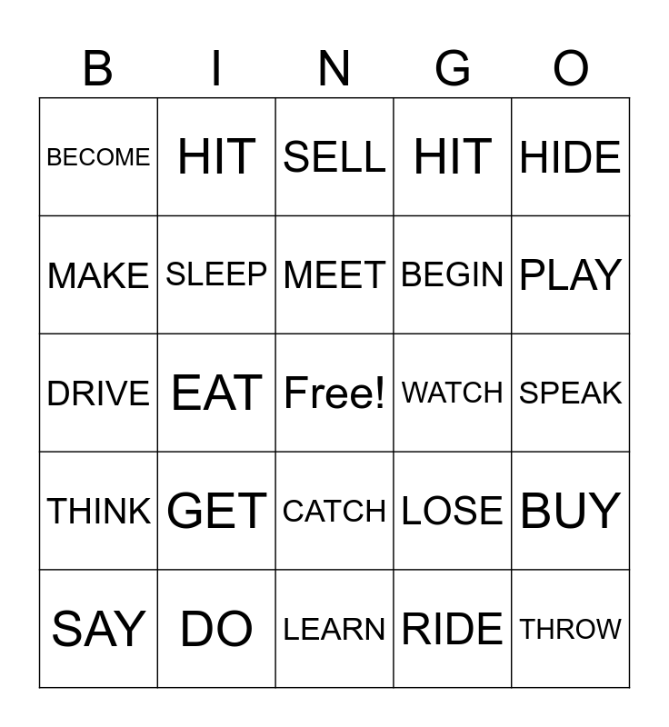 This bingo card has a free space and 24 words: GET, DO, MEET, SAY, HIDE, BECOME, MAKE, HIT, WATCH, CATCH, BEGIN, DRIVE, LOSE, BUY, SLEEP, RIDE, SPEAK, SELL, PLAY, EAT, THROW, THINK, HIT and LEARN.