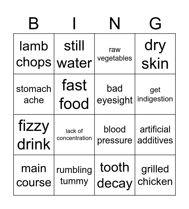 This bingo card has 16 words: rumbling tummy, artificial additives, raw vegetables, lamb chops, fizzy drink, still water, blood pressure, tooth decay, stomach ache, fast food, main course, dry skin, lack of concentration, get indigestion, bad eyesight and grilled chicken.