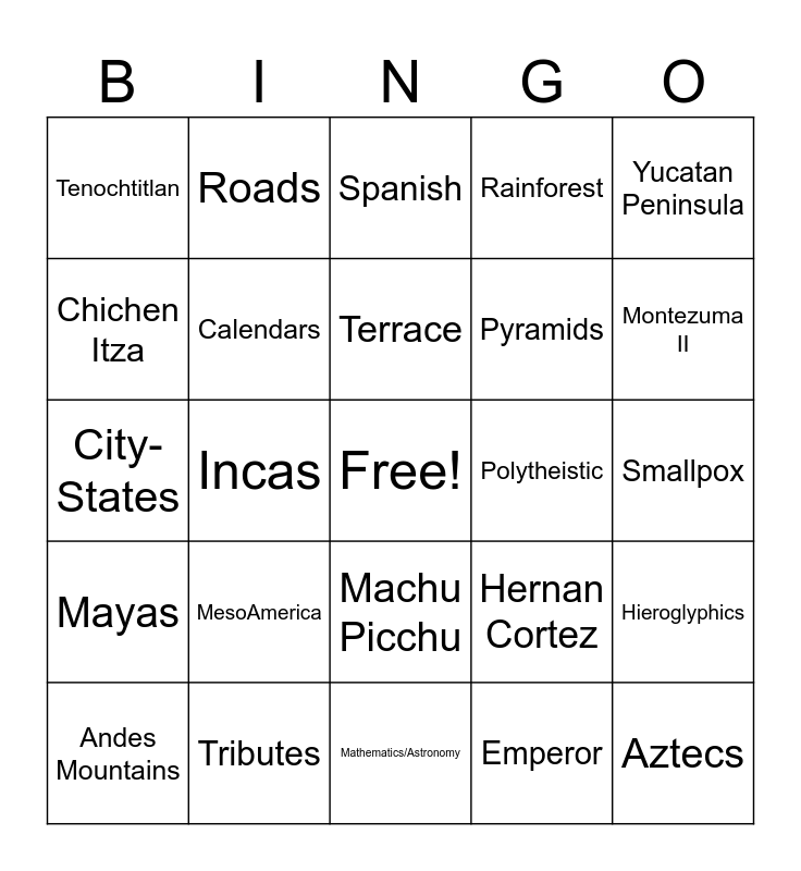 This bingo card has a free space and 24 words: MesoAmerica, Tributes, Terrace, Andes Mountains, Yucatan Peninsula, Tenochtitlan, Chichen Itza, Roads, Polytheistic, Machu Picchu, Pyramids, City-States, Hernan Cortez, Hieroglyphics, Calendars, Emperor, Smallpox, Spanish, Montezuma II, Incas, Aztecs, Mayas, Rainforest and Mathematics/Astronomy.