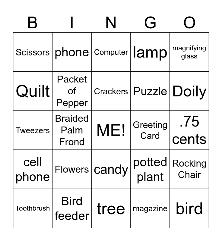 This bingo card has a free space and 54 words: crossword puzzles, cell phone, a heart, slippers, candy, bed, lamp, TV, Quilt, Painting, Scissors, Pillow, Bird feeder, Toothbrush, jewelry box, tree, bird, Puzzle, batteries, .75 cents, potted plant, fake plant, Greeting Card, magnifying glass, glasses, phone, radio, image of a bird, image of a butterfly, magazine, coloring book, markers, colored pencils, Novel, Computer, Photo, Tweezers, Rocking Chair, Cross, Packet of Pepper, Basket, Stuffed Animal, A Child’s Artwork, Curtains, Flowers, Remote, Coffee Cup, Pen, Crackers, Braided Palm Frond, Doily, Figurine, Piece of Mail and Notepad.