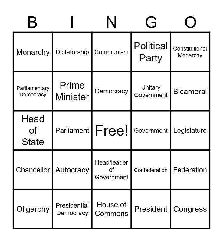 This bingo card has a free space and 24 words: Autocracy, Presidential Democracy, Democracy, Oligarchy, Constitutional Monarchy, Monarchy, Parliamentary Democracy, Dictatorship, Government, Head/leader of Government, Unitary Government, Head of State, Confederation, Federation, Prime Minister, President, Legislature, Communism, Bicameral, Parliament, Congress, Chancellor, Political Party and House of Commons.