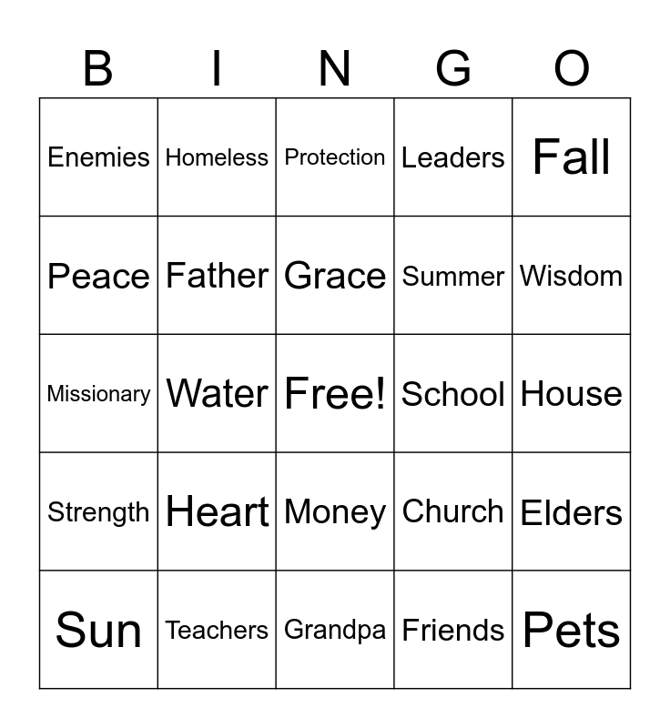 This bingo card has a free space and 24 words: Sun, Heart, Grace, Friends, Fall, Enemies, Homeless, Protection, School, House, Missionary, Father, Church, Elders, Peace, Teachers, Grandpa, Leaders, Wisdom, Strength, Water, Money, Summer and Pets.