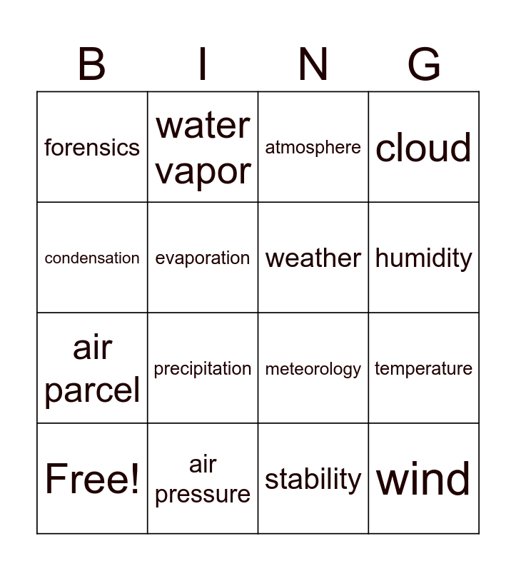 This bingo card has 17 words: Free!, air pressure, atmosphere, cloud, air parcel, evaporation, meteorology, humidity, condensation, precipitation, stability, temperature, forensics, water vapor, weather, wind and troposphere.