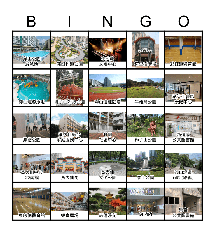 This bingo card has 25 images and 25 words: 黃大仙祠, 志蓮淨苑, 斧山道運動場, 東啟德體育館, 彩虹道體育館, 摩士公園 游泳池, 斧山道游泳池, 蒲崗村道公園, 獅子山公園, 黃大仙 文化公園, 牛池灣公園, 鳳德公園, 摩士公園, 沙田坳道 (遠足路徑), 獅子山郊野公園, 樂富 公共圖書館, 新蒲崗 公共圖書館, 牛池灣 文娛中心, 黃大仙地區 康健中心, 黃大仙綜合 家庭服務中心, 竹園 社區中心, 樂富廣場, 黃大仙中心 北/南館, 荷里活廣場 and Mikiki.
