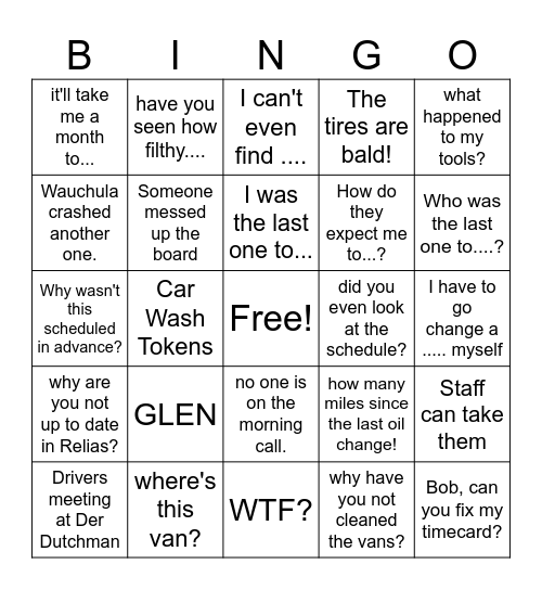 This bingo card has a free space and 24 words: GLEN, where's this van?, I was the last one to..., Drivers meeting at Der Dutchman, what happened to my tools?, it'll take me a month to..., Wauchula crashed another one., have you seen how filthy...., did you even look at the schedule?, no one is on the morning call., How do they expect me to...?, Why wasn't this scheduled in advance?, how many miles since the last oil change!, Staff can take them, Someone messed up the board, why have you not cleaned the vans?, I have to go change a ..... myself, I can't even find ...., Who was the last one to....?, Car Wash Tokens, Bob, can you fix my timecard?, why are you not up to date in Relias?, The tires are bald! and WTF?.
