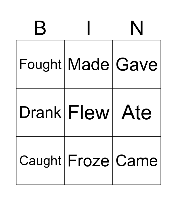 This bingo card has 60 words: Were, Began, Broke, Brought, Built, Bought, Caught, Chose, Came, Drew, Drank, Drove, Ate, Fell, Felt, Fought, Found, Flew, Forgot, Froze, Got, Gave, Went, Had, Heard, Held, Was, Kept, Knew, Learnt, Left, Led, Lay, Lost, Made, Meant, Met, Paid, Rode, Ran, Said, Saw, Sold, Sent, Sang, Sat, Slept, Spoke, Spent, Stood, Stole, Swam, Took, Taught, Told, Thought, Understood, Woke, Wore and won.